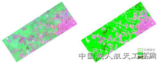 拍摄图像,位于河南省长葛市。左边为天宫一号图像,其中绿色为农作物,主要为小麦,紫色为城镇用地。利用高光谱图像,可以对耕地和城镇用地进行区分,并评价农作物的长势,右边为监测结果。